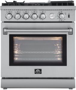The Lazio 30 Inch Alta Qualita Gas Range brings a blend of professional style and performance to your kitchen, featuring a robust stainless-steel design. Its 5 sealed burners, including a potent dual-ring burner for boiling or searing, offer a total output of 70,000 BTU, with the added ability to simmer for delicate tasks like melting chocolate or sauces. Notable features include continuous cast iron grates, a wok support, and a reversible griddle for versatile cooking. The 30 Inch oven boasts a 4.32 cu. ft. capacity, a combined broil and bake output of 26,000 BTUs, and a 3-layer glass oven door window. The automatic internal convection fan ensures fast and precise temperature control for consistent cooking. The appliance includes 2 oven racks, an air fryer basket, a drip pan suitable for steam cleaning, and an LP conversion kit. Additionally, the zinc-coated metal knobs with bezel rings promise enduring beauty over time.Read More