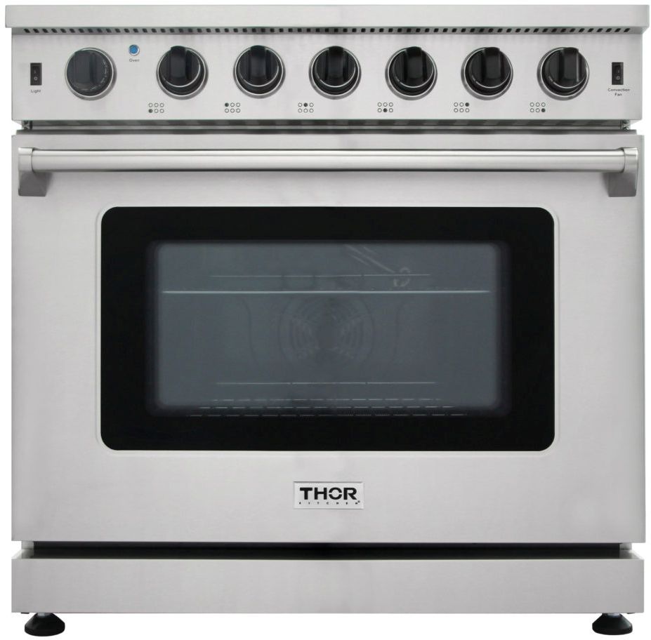 A 36 inch professional gas range featuring 6.0 cu. ft oven capacity, commercial convection fan, and stainless steel finish.